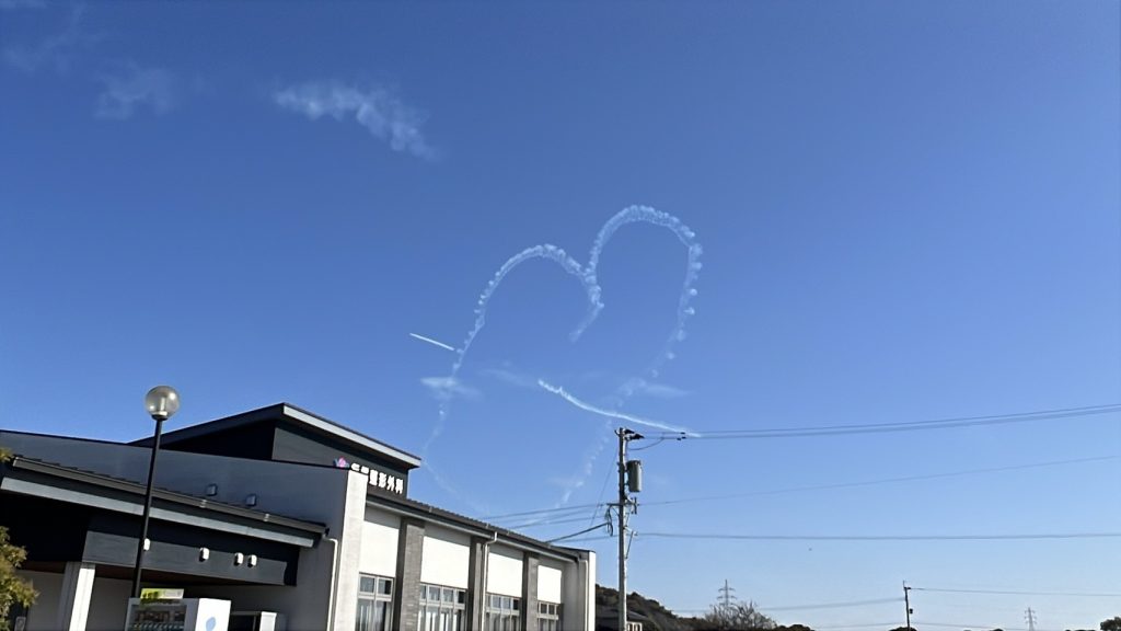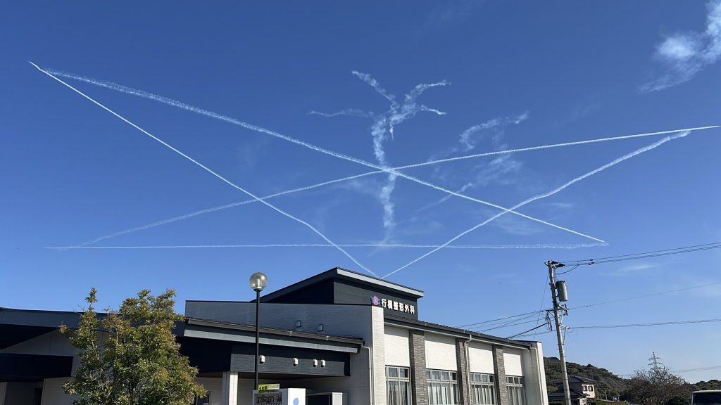 仕事終わりに外にでると轟音とともにブルーインパルスが青空の中で練習していました。